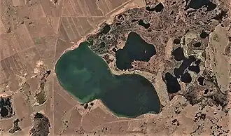 There is a cluster of smaller lakes and swamps stretching northeastwards from the eastern side up to Sitnikovo and Paklino, the largest of which is Chernakovo. Lake Gorkoye (Tyumentsevsky District) is located 54 kilometers (34 mi) to the northeast. Lake Kulunda lies 70 kilometers (43 mi) to the west and Gorkoye (Romanovsky District) 54 kilometers (34 mi) to the southeast.[2][1]