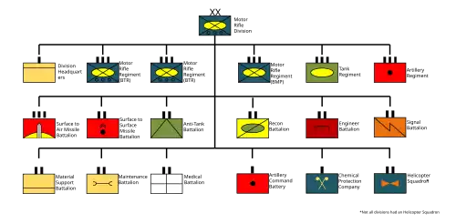 The Motor Rifle Battalion was the basic building block of the division, as it was the lowest level containing its own organic mortar, signals, Anti-Aircraft, Anti-Tank, and support elements. There were three motor rifle battalions per regiment.[12]