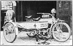 Motorcycle ambulances were used during World War I by the British, French, and Americans. At the time, the advantages of light weight, speed, and mobility over larger vehicles was cited as the motive for the use of motorcycles with sidecar in this role. The US version had two stretchers arranged one on top of the other.[6][7][8] The French ambulance used a sidecar that held a single patient, who could either lie down or sit up.[9]