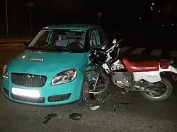 In 2012, 75% of two-vehicle motorcycle accidents involved the motorcycle crashing into the vehicle ahead of it and only 7% involved the motorcycle being hit in the rear.[27] That year half of all fatal accidents were two-vehicle crashes,[27] However, they also had the highest rate of collision with fixed object between passenger cars, light trucks, and heavy trucks; with a 22% of fatalities being single-vehicle crashes with a fixed object.[27] Of the two-vehicle crashes one nearly 40% involved the motorcycle hitting another vehicle turning left.[27]