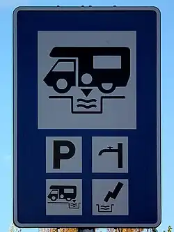 A motorhome stopover (German: Reisemobil-Stellplatz, Italian: Aree di Sosta, French: Aire de Service) is a place designated for the purpose of overnight stopping for recreational vehicles or motorhomes. Motorhome stopovers are usually operated by local authorities. These vehicles can stay overnight or longer depending on terms and conditions specified on a sign by each locality. Parking is in accordance with local building codes and road traffic law.