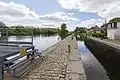 In 1877, a metal footbridge linking the flour mill to the Macaire lock was erected, overlooking the spillway for 40 meters. This footbridge replaces the passing boat upstream of the dam, removed by prefectural decree of March 11, 1875. On June 2, 1888, Fidèle Simon, owner of the flour mill, was ordered to remove the footbridge, responsible for an accident which occurred on December 31, 1879, causing damage to the Macaire dam.