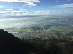 Mount Arayat stands in the middle of the largely-agricultural 15 to 35 metres (49 to 115 ft) AMSL Central Luzon Plain, serving as a distinct landmark in Pampanga province.[8] The mountain is topped by a circular volcanic crater about 1.2 kilometres (0.75 mi) in diameter, much of which has collapsed on the western and part of the northern rim due to erosion. This has resulted in a breached crater which opens in a west-northwest direction. This area is the apparent source of a major debris-avalanche deposit that forms hummocky terrain beyond the west and northwest sides of the volcano. The 1,026-metre (3,366 ft) summit stands on the northeast side of the breached crater, known as North Peak, while the 984-metre (3,228 ft) Pinnacle Peak is located on the southeast crater rim.[9] Post-collapse activity formed an andesitic lava dome known as White Rock in the collapse amphitheater.[1]
