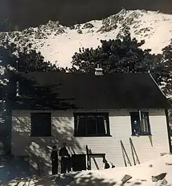 The ski hut is operated by the Sierra Club Angeles Chapter[25] and available for year-round use on weekends. It marks the approximate halfway point on the Ski Hut Trail, at an elevation of 8,200 ft.[26] It has a fully-equipped kitchen, piped water, solar lighting, a wood-burning stove, dormitory loft beds for about sixteen visitors, and an outhouse with a view.[27] The hut is located at the base of Baldy Bowl, recognized as a superb skiing area in the early 1930s. The Ski Mountaineers section of the Sierra Club,[28] formed in 1935, was granted permission by the U.S. Forest Service to construct a hut in this location.[29]