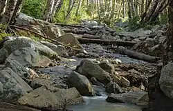 Higher up, the yellow pine forest community gives way to a pure lodgepole forest. Near 9,000 ft (2,750 m) these become increasingly krummholzed, and beyond about 9,500 ft (2,900 m) lies an unforested alpine zone. Mountain mahogany trees grow on the slopes above San Antonio Creek.