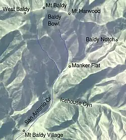East of the summit is Mount Harwood, which is in turn connected by a narrow ridge, "The Devil's Backbone," to a pass known as the Baldy Notch. At the Notch there is a ski resort, the closest one to Los Angeles. South of the resort, and connected to its ski lift by an asphalt road, lies Mt Baldy Village.