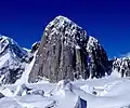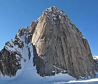 Another popular route to the summit is the Cobra Pillar, a direct line up the central pillar of the east face. Named for its resemblance to a cobra from certain angles, this route is rated YDS 5.11.[7] The first ascent of this route was made by Jim Donini and Jack Tackle over six days in June 1991.[8][9] The first one-day speed ascent of the route was made in June 2004 by Joe Puryear and Chris McNamara.[10]