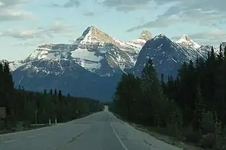 Mount Christie centered above the Icefields Parkway with Brussels Peak to its right and Mount Lowell furthest to right