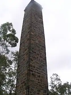 The chimney is thought to be the oldest surviving mining industry chimney in Queensland, also being among the first built.[8] It stands about 13.8 metres (45 ft) high,[5] although early descriptions reported a height of 66 feet (20 m).[3] It was constructed from local bluestone, clamped with iron, and held together with a lime and sand mortar.[3][5] Firebricks lining the furnace and chimney were made from good quality local fireclay.[3][7]