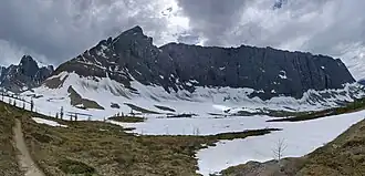 ![]() Mount Drysdale (left of center) with the Rockwall (right) as seen from Rockwall Pass | |