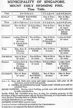 On 24 March 1931, at a municipal meeting, the diving board was converted into a spring board and cubicles were given wire netting as roof coverage.[4] At another municipal meeting on 26 July 1931, a swimming gala was decided to be held at Mount Emily Swimming Pool on 15 August along with other things such as the painting of the floor of the pool at S$450.00, by-laws for the pool, management of the pool, and admission prices for the pool.[5] Quarterly season tickets cost S$1.50 and S$2.50 for people aged below and above 17, respectively and admission prices cost S$0.10 and S$0.20 for swimming and mixed bathing, respectively.[5] At certain times, students were allowed to enter for free.[6]