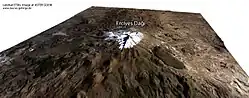 The last event was the collapse of the eastern flank of Ercyies. This collapse was probably triggered by an earthquake, considering that no evidence for a concomitant eruption exists.[2][41] Considering the ages of the oldest moraines contained within the collapse scar, it probably happened more than 25,000 years ago.[60] This collapse generated a debris avalanche 16 kilometres (9.9 mi) long which dammed a lake and presently forms a hummocky deposit.[117] The volume of rock removed by the collapse is about 1.2–1.5 cubic kilometres (0.29–0.36 cu mi).[118]