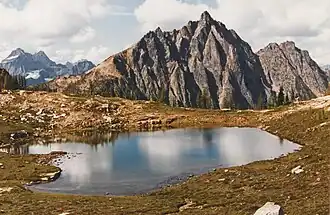 Mount Hardy is an 8,099-foot (2,469-metre) mountain summit located on the common border of Okanogan County with Skagit County in Washington state. It is part of the Okanogan Range which is a sub-range of the North Cascades Range.[2] Mount Hardy is situated west of Methow Pass, at headwaters of the Methow River, on land administered by the Okanogan–Wenatchee National Forest. Topographic relief is significant as the summit rises approximately 2,500 feet (760 meters) above the West Fork Methow River in one-half mile (0.8 km). The nearest higher peak is Golden Horn, 1.75 miles (2.82 km) to the northeast.[2] Mount Hardy can be seen from the North Cascades Highway which traverses below the southwestern base of the mountain. This mountain's toponym was officially adopted in 1973 by the United States Board on Geographic Names.[3]