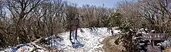 Climbing mountains is a popular sport in the Mount Hakone area. To the top of Mount Kami, it takes about one hour fifteen minutes from Mount Koma Summit Station of the Hakone Komagatake Ropeway (one hour twenty minutes, on return), or one hour twenty minutes from Ōwakudani Station of the Hakone Ropeway (one hour, on return).[2] The top of Mount Kami is covered with tall trees, which prevent a nice view of its surroundings.
