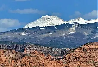 Mount Mellenthin is a 12,645-foot (3,854 meter) elevation summit located in San Juan County of Utah, United States.[3] Mount Mellenthin is the second-highest peak of the La Sal Mountains, and second-highest in the county.[2] It is situated in a dry, rugged, sparsely settled region, and set on land administered by Manti-La Sal National Forest. Precipitation runoff from this mountain drains into tributaries of the Colorado River. The nearest town is Moab, 20 mi (32 km) to the northwest, and the nearest higher neighbor is Mount Peale, 1.7 mi (2.7 km) to the south. The mountain's name honors Rudolf E. Mellenthin (1884–1918), forest ranger of La Sal National Forest, who was shot to death near this peak on August 23, 1918, while attempting to apprehend two draft evaders.[3] This geographical feature's toponym was officially adopted in 1932 by the U.S. Board on Geographic Names.[3]