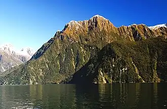 Mount Philipps is situated above Milford Sound in the Southland Region of the South Island. It is set within Fiordland National Park which is part of the Te Wahipounamu UNESCO World Heritage Site.[2] Precipitation runoff from the mountain's north slope drains to Milford Sound via Sinbad Gully, and the south slope drains into Camp Oven Creek → Arthur River → Milford Sound. Topographic relief is significant as the summit rises above tidewater of Milford Sound in 1.5 kilometre, and 900 metres (2,953 feet) above Camp Oven Creek in 0.75 kilometre. The nearest higher neighbour is Devils Armchair, 2.12 kilometres to the southwest.[2] The mountain's toponym was applied by Captain John Lort Stokes of the HMS Acheron while charting the coast of New Zealand between 1848–1851 to honour his first Lieutenant, Griffith Grismond Philipps (1811–1891).[4][5] This mountain's toponym has been officially approved by the New Zealand Geographic Board.[4]