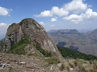 The lower slopes are mostly cultivated. Dry miombo woodland can be found on the middle slopes, and in the valley between the east and west peaks. The highest peaks are mostly bare granite, with pockets of montane heathland. The mountain has no year-round streams, but several intermittent streams run during the wet season.[2]