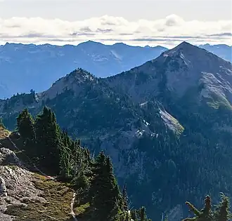 Mount Scott is part of the Bailey Range, which is a subrange of the Olympic Mountains, and is set within the Daniel J. Evans Wilderness.[4] The nearest higher neighbor is line parent Mount Ferry, 1.8 mi (2.9 km) to the west, Ludden Peak is set one mile to the north, and Mount Pulitzer rises two miles to the west-southwest.[4] Precipitation runoff from the mountain drains into tributaries of the Goldie River, which in turn is a tributary of the Elwha River. Topographic relief is significant as the summit rises 4,300 feet (1,310 m) above the Elwha Valley in approximately two miles.