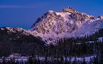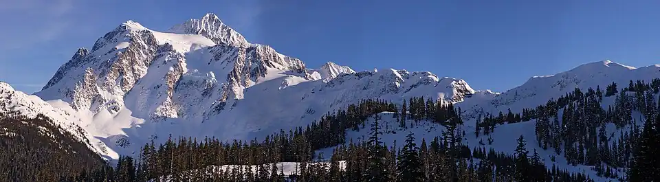 Mount Shuksan (/ˈʃəksɪn/) is a glaciated massif[3] in the North Cascades National Park. Shuksan rises in Whatcom County, Washington immediately to the east of Mount Baker, and 11.6 miles (18.7 km) south of the Canada–US border. The mountain's name Shuksan is derived from the Lummi word [šéqsən], said to mean "high peak".[4] The highest point on the mountain is a three-sided peak known as Summit Pyramid.[5]