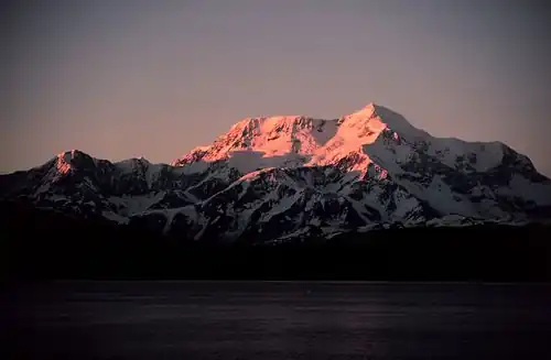 European explorers first sighted the mountain on July 16, 1741, with the arrival of the expedition commanded by Vitus Bering, a Danish-born Russian explorer to what is now called Cape Saint Elias. While some historians contend that Bering named the mountain, others believe that eighteenth-century mapmakers named it after Cape Saint Elias when Bering left the peak unnamed.[2]
