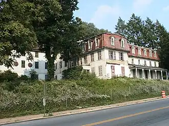 The hotel's site was added to the National Register of Historic Places on 2 March 1982.[3] The hotel's site remained privately occupied until 1988, when the property was completely closed.[5] Since the founding of the new Ephrata Community Hospital, the Mountain Springs facility fell into considerable disrepair, sprouting local legends and becoming known as the "haunted house" among local children. The contents of the hotel were sold at an on-site auction in 1991. Throughout the 1990s and into the early 2000s, a variety of reuse proposals were considered and rejected. A July 1992 proposal planned to subdivide 8.3 acres (34,000 m2) of the property for redevelopment, to reuse the frame hotel building, but to demolish some of the oldest structures on the property.[4]