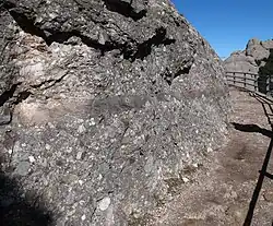 Montserrat is formed of conglomerate that was originally deposited in a fan delta at the margin of the Ebro Basin, part of the foreland basin to the Pyrenees, during the middle Eocene. The conglomerate was derived from the uplifting Catalan Coastal Ranges to the southeast of the basin and the clast type is dominated by Triassic sedimentary rocks. The fan had an original size of between 100 and 150 square kilometres.[4] The resistance of the Montserrat conglomerate to erosion compared to the rest of the fill of the Ebro Basin explains its current mountainous nature.[5]