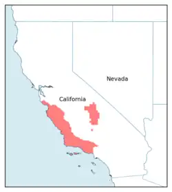 The frog is an endangered species under the US Endangered Species Act.[3] It is separated into two distinct population segments (DPS): a northern DPS, listed endangered since 2014,[4] and a southern DPS that was listed endangered in 2002.[5] The two DPS are separated by the Tehachapi Mountains, and occupy unique habitats: the northern DPS lives in lakes or slow-moving water bodies at alpine and subalpine elevations in the Sierra Nevada, while the southern DPS lives in faster flowing and warmer waters of the chaparral, although it may also occur at higher elevations in the Transverse Range.[4]: 24263–2464 In addition, the DPS show genetic divergence, likely reflecting ancient reproductive isolation.[4]: 24263–2464