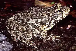 Rana muscosa is 4 to 8.9 centimetres (1.6 to 3.5 in) long. Females tend to be larger than males.[6] Its color and patterning are variable. It is yellowish, brownish, or olive with black and brown markings. The underside of its hind legs can be different hues of yellow, from a bold sun yellow to a lighter pale yellow; larger ones may can hints of orange on their hind legs. The throats of it range from white to yellow.[7] Along with its variable coloration, the frog also has a dorsal pattern with dark spots in different shapes and sizes. Its species name muscosa is from the Latin meaning "mossy" or "full of moss", inspired by its coloration. It may have light orange or yellow thighs. When handled, the frog emits a defensive odor reminiscent of garlic.[8]
