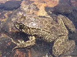 The frog lacks a vocal sac. Its call is raspy, rising at the end. During the day, it calls underwater.[8] The frogs tend to be less active during the winters and more active during the mating season. For years when there is heavy snow at high elevations, they may only be active for 90 days in the summer.[7] Hibernation tends to happen underwater or in the crevices of stream banks. This occurs during the cold months of winter. Hibernation ends in the spring to start the breeding season.[3] This species feeds on aquatic insects and benthic invertebrates. Their diet varies depending on the habitat type. When living in streams, it tends to eat terrestrial insects such as beetles, ants, bees, wasps, flies, and dragonflies.[7] They are also known to eat larvae of other frogs and toads, as well as commit cannibalism.[8]