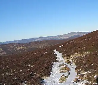 Some sources regard the Mounth as extending as far west as Drumochter Pass (A9),[3] but it is now generally agreed to start at the Cairnwell Pass (A93 – highest main road pass in Britain, Glen Shee ski centre).[4] Here, a high undulating plateau invaded by deep glacial troughs (Glen Isla, Glen Callater, Glen Muick, Glen Clova) culminates in Glas Maol (1,068 m or 3,504 ft) on the main watershed, with the outlying granite Lochnagar (1,155 m or 3,789 ft) and its surrounding "White Mounth" (Monadh Geal). To the east the plateau broadens into a lower moorland incised by river valleys, notably Glen Esk and Glen Tanar, descending gently east to North Sea coastal cliffs between Stonehaven and Aberdeen. This is the best-preserved expanse of the ancient Highland pre-glacial upland surface.[5]