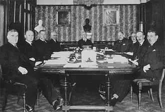 ![]() The cabinet in 1933. From left to right: Kobro, Sunde, Meling, Five, Prime Minister Mowinckel, Monsen Mjelde, Berg Lund, Liestøl and Utheim. | |
