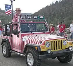 ![]() Jerry Haynes, dressed as Mr. Peppermint, participating in Red River, New Mexico 4th of July parade | |