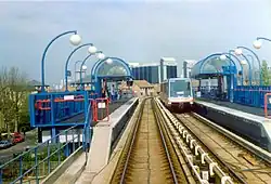 Mudchute is a Docklands Light Railway (DLR) station on the Isle of Dogs, next to Mudchute in London, England. The station is situated in the Millwall area and is in Travelcard Zone 2. The name of the area refers to the engineering overspill when Millwall Dock was being created in the 1840s.[7] Spoil from the excavation of the Dock and silt from its channels and waterways were dumped on nearby land, creating "The Mudchute", which quickly established itself as a wildlife habitat and adventuring location for local children.