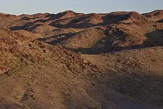 The Muggins Mountain Wilderness is a 7,711-acre (31.21 km2) wilderness area in the U.S. state of Arizona.[2] It is located approximately 38 miles (61 km) east of Yuma, Arizona in the Muggins Mountains and adjacent to the agricultural Dome Valley and Gila River. The wilderness area is made up of the highest peak in the southern section of Muggins Mountains, Klothos Temple at 1,666 feet (508 m). Muggins Peak is adjacent to the peak southeastwards, at 1,424 feet (434 m). Three deeply cut washes drain the southwest border of the wilderness, Twin Tanks Wash, Muggins Wash, and Morgan Wash. Muggins Wash is the access point to the wilderness, by way of County 7th Street.
