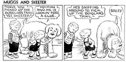 ![]() The first two panels of the October 6, 1936, Muggs and Skeeter, by Wally Bishop. Muggs is on the left, Skeeter is in the middle, and their dog Hoiman is on the right. | |
