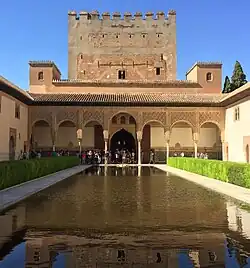 The Emirate of Granada was the last remaining Muslim state on the Iberian Peninsula, founded by Muhammad I in the 1230s.[1] Through a combination of diplomatic and military manoeuvres, the emirate succeeded in maintaining its independence, despite being located between two larger neighbours: the Christian Crown of Castile to the north and the Muslim Marinid Sultanate in Morocco. Granada intermittently entered into alliance or went to war with both of these powers, or encouraged them to fight one another, in order to avoid being dominated by either.[2] From time to time, the sultans of Granada swore fealty and paid tribute to the kings of Castile, an important source of income for Castile.[3] From Castile's point of view, Granada was a royal vassal, while Muslim sources never described the relationship as such.[4]