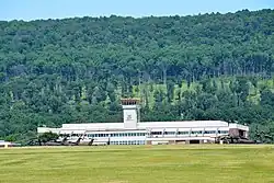 Muir Army Airfield was established as an airstrip in the 1930s and was originally the central parade ground and emergency landing field of the Fort Indiantown Gap military reservation. On July 12, 1941, the first airplane piloted by Major Edgar Scattergood, Air Office of the 28th Infantry Division, landed on the newly dedicated Muir Field.[2] The 3,200 x 100 foot runway was of good size for fixed-wing aircraft at the time; however, the Army Corps of Engineers built the runway in a northeast-southwest direction. The prevailing wind blows out of the mountains from the northwest, so there is usually a permanent crosswind during normal weather conditions.