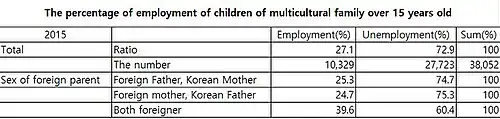 Present situation: The percentage of employment of children of multicultural family over 15 years old is 27.1% in 2015. It means only 10,329 children find a job among total 38,052 children. The percentage of employment of children who both parents are foreigner is 39.6%. And it is higher than children who are grown by Korean mother and foreign father (25.3%), children who are grown by foreign mother and Korean father (24.7%).[13]