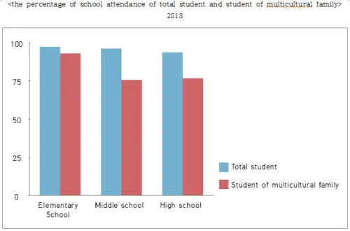 About the percentage of school attendance of student of multicultural family, elementary school attendance percentage is 97.2%, middle school is 75.6%, high school is 76.7%. It shows a low standard in compared with total percentage of school attendance. About the total percentage of school attendance, elementary school is 97.2%, middle school is 96.2%, and high school is 93.6%.[11]