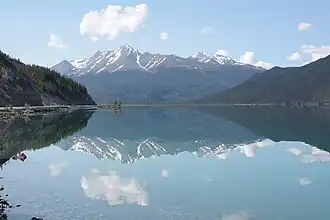 The lake is part of the Muncho Lake Provincial Park and located at kilometre 681 (mile 423)[1] of the Alaska Highway. The lake is about 12 km (7.5 mi) long and its width varies. It reaches a maximum depth of 110 m (360 ft). The surrounding peaks (the Terminal Range of the Muskwa Ranges to the west and the Sentinel Range to the east) reach altitudes of more than 2,000 m (6,600 ft), while the lake lies at an elevation of 820 m (2,690 ft). It is formed along the Trout River, a tributary of the Liard River.