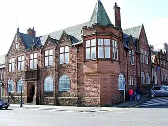 The new building was designed in the Scottish Baronial style, built in red sandstone rubble masonry with ashlar dressings and was completed in 1924.[1] The design involved an asymmetrical main frontage with five bays facing onto Shore Street; the central bay featured, on the ground floor, a deeply recessed doorway with a cavetto-surround supporting a panel with a carved coat of arms; there was a cross-window on the first floor and a date stone above. The other bays were fenestrated with Diocletian windows on the ground floor and cross-windows on the first floor. There was a gable containing a small two-part window above the first two bays on the left and a short corbeled and castellated tower with a hexagonal roof on the corner to the right.[1] Internally, the principal room was the council chamber, which was wood panelled.[7]