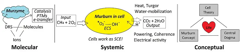 (iii) Murburn concept serves as a unifying umbrella for connecting acute-timescale cellular powering, coherence, homeostasis, electro-physiological/mechanical and sensory/response facets. Thus, it should be considered as a fundamental principle of life, along with cell theory and central dogma.[49][62]