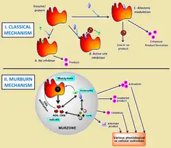 Further, though burning is a reaction that usually involves oxygen (aerobic process), "burning flames"[4] produced by anoxic oxidants are also well-known.[4] Therefore, the enzymes working via murburn scheme (aerobic or anaerobic) could be called murzymes and the region around the biomolecule where the DRS interacts with the final ‘substrate’ is called ‘murzone’.[5]