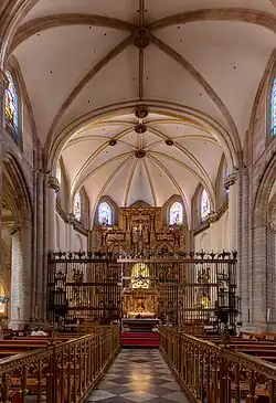 In 1854 the cathedral suffered a terrible fire that destroyed the high altar and the choir stalls. The repair works consisted in the creation of a new neo-Gothic altarpiece (work of the sculptors Pescador and Palao), and the commission of a majestic organ, undertaken by the Belgian firm Merklin-Schütze. Under the organ 16th-century plateresque chairs from the Monastery of Santa Maria de Valdeiglesias were installed, a donation made by Queen Isabel II to the cathedral.