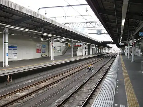 The station consists of two ground-level side platforms serving two tracks,[2] with an elevated station building.