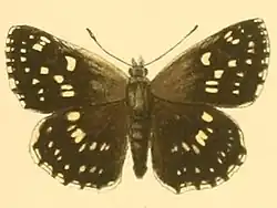 H. gigas Brem. (85 f). Upperside of the wings blackish grey. Size considerable, 48 to 50 mm. Ground of wings black. The white spots small. Female black, with the spots small and but little numerous. The hindwing black, ab. minor ab. nov. has only the size of tessellum and all the spots well developed. From Amurland.[2]