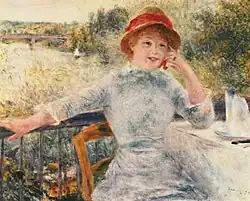 In 1907, mushroom hats in both straw and felt became popular. Such was their ubiquity that Evelyn Sharp lambasted them in an editorial in The Guardian, writing: "For about six months have we endured the sight of mushroom shapes in every kind of straw trimmed with a fringed silk scarf. I suppose there was some attraction in the mushroom hat when it was first designed, and I can still see its charms when it is very small and very flexible....worn by somebody in a motor car. But this autumnal growth of felt fungi deserves nothing but condemnation".[3] Her words fell on deaf ears as the popularity of mushroom shapes persisted. In 1909, a full-page advertisement in The Times describing Selfridge & Co's millinery choices detailed a mushroom brim hat decorated with ostrich feathers.[4] In the same year, Dickins & Jones offered a: "becoming mushroom hat...trimmed with wide Velvet Ribbon and a Large Posy of Flowers at side".[5] By 1915, variations on the design for younger girls included almost brimless mushroom models – similar to a cloche or bucket hat.[6]