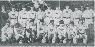 Front row, L-R: Josephine Hasham, Betty McKenna, Noella Leduc, Renae Youngberg, Margaret Russo, Nancy Mudge, Betty Jean Peterson, Ruth Middleton. Back row, L-R: Kay Kimble (chaperone), Chris Ballingall, Phyllis Baker, Kathryn Vonderau, Marilyn Jones, Naomi Meier, Barbara Sowers, Jean Cione, Marjorie Pieper, Joe Cooper (manager).