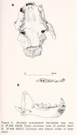 The earliest true polecat was Mustela stromeri, which appeared during the late Villafranchian. It was considerably smaller than the present form, thus indicating polecats evolved at a relatively late period. The steppe polecat's closest relatives are the European polecat and black-footed ferret, with which it is thought to have shared Mustela stromeri as a common ancestor.[7] The steppe polecat likely diverged from the European polecat 1.5 million years ago based on IRBP, though cytochrome b transversions indicate a younger date of 430,000 years.[8] As a species, the steppe polecat represents a more specialised form than the European polecat in the direction of carnivory, being more adapted to preying on larger rodent species; its skull has a stronger dentition, its projections are more strongly developed and its muscles of mastication are more powerful. The steppe polecat's growth rate is also much slower than the European polecat's, as its skull undergoes further development at an age when the European polecat has attained full growth.[3] The species may have once been present in Pleistocene central Alaska.[9]