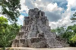Muyil (also known as Chunyaxché) was one of the earliest and longest inhabited ancient Maya sites on the eastern coast of the Yucatan Peninsula. It is located approximately 15 kilometres (9.3 mi) south of the coastal site of Tulum, in the Municipality of Felipe Carrillo Puerto in the state of Quintana Roo, Mexico. Artifacts found here date back from as early as 350 BC. to as late as 1200-1500 AD. The ruins of Muyil are an example of Peten architecture, like those found in southern Mayan sites with their steep walled pyramids such as Tikal in Guatemala. It is situated on the Sian Ka'an lagoon, a name meaning "Where the Sky is Born". Muyil was located along a trade route on the Caribbean once accessible via a series of canals. Among the most commonly traded goods were Jade, obsidian, chocolate, honey, feathers, chewing gum, and salt. It is believed that throughout much of its history, Muyil had strong ties to the center of Coba located some 44 kilometres (27 mi) the north / northwest.[1] The 2010 federal census reported a population of 191 inhabitants in the locality.[2]